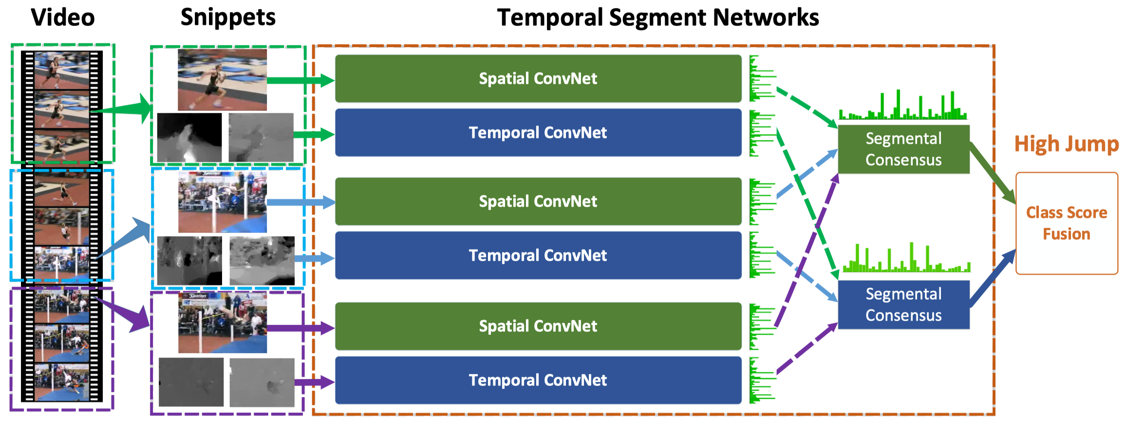 우선 여기서 제시하는 TSN은 전체 비디오의 visual information을 활용하기 위해 역시 기존 방법론을 어느 정도 차용해 Spatial ConvNet과 Temporal ConvNet으로 이루어져 있다. TSN은 전체 비디오에서sparsely sampled된 스니펫들을 이용해서 임시 예측을 거치고, 그러한 스니펫들에 대한 예측 결과를 하나로 합쳐 전체 비디오에 대한 레이블을 내놓게 된다. 기존의 two stream 방법론에서는 모든 스니펫들에 대한 모든 classification 각각을 바로 비디오 전체에 대한 label과 비교하여 loss로 활용했는데, TSN은그러한 정보를 하나로 합치는 과정이 추가되었다.